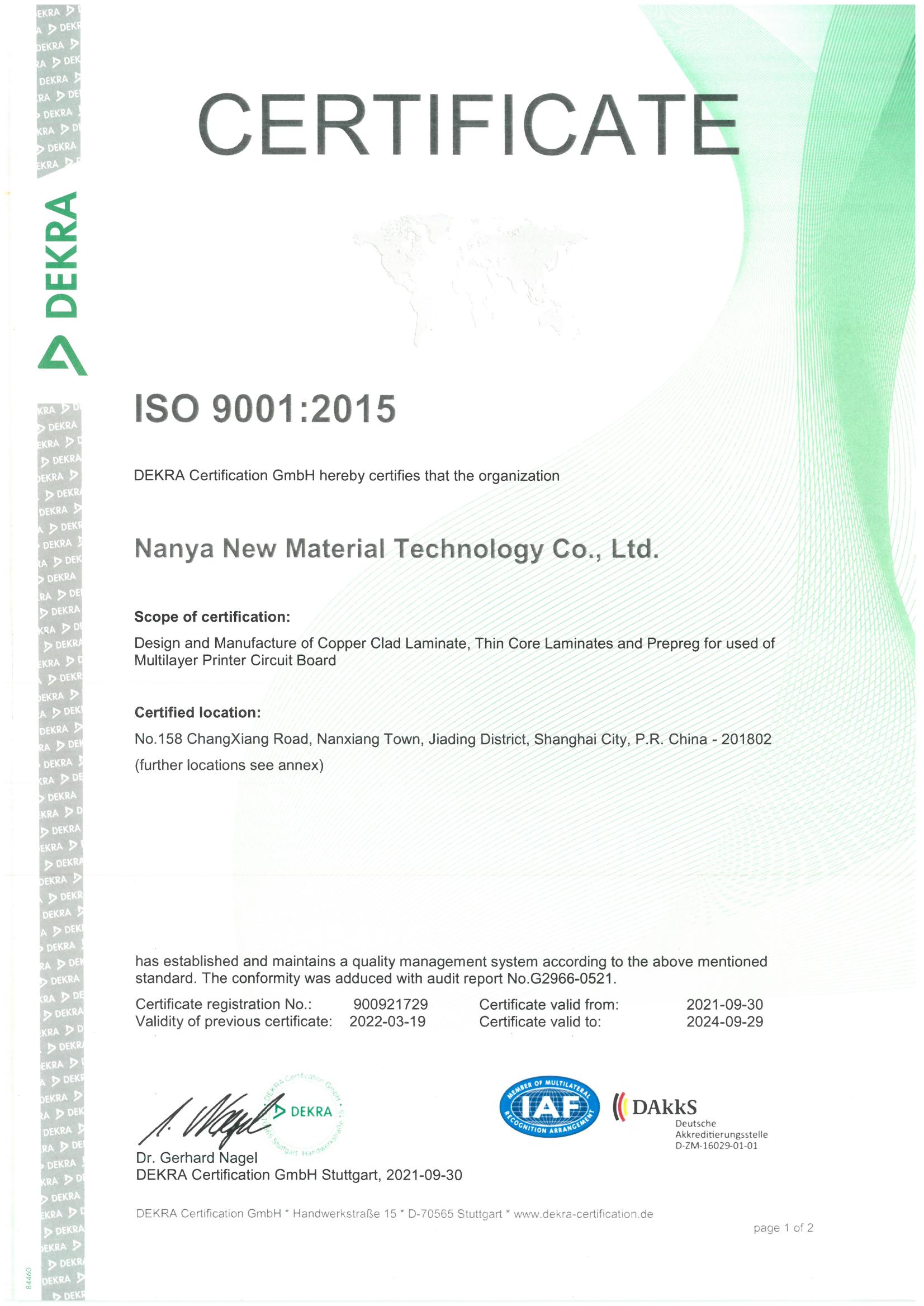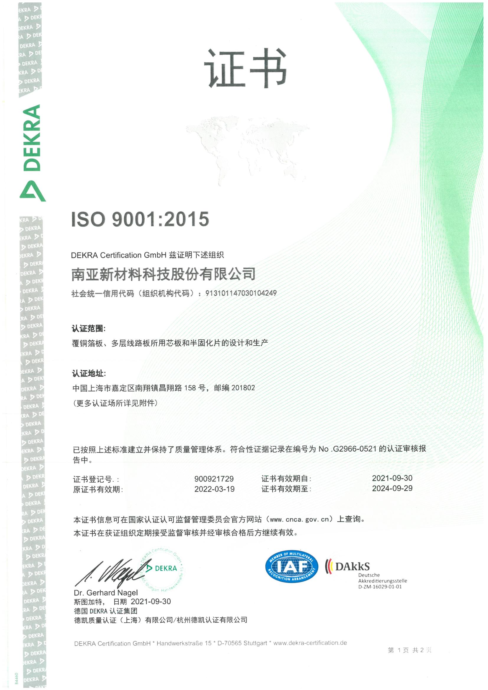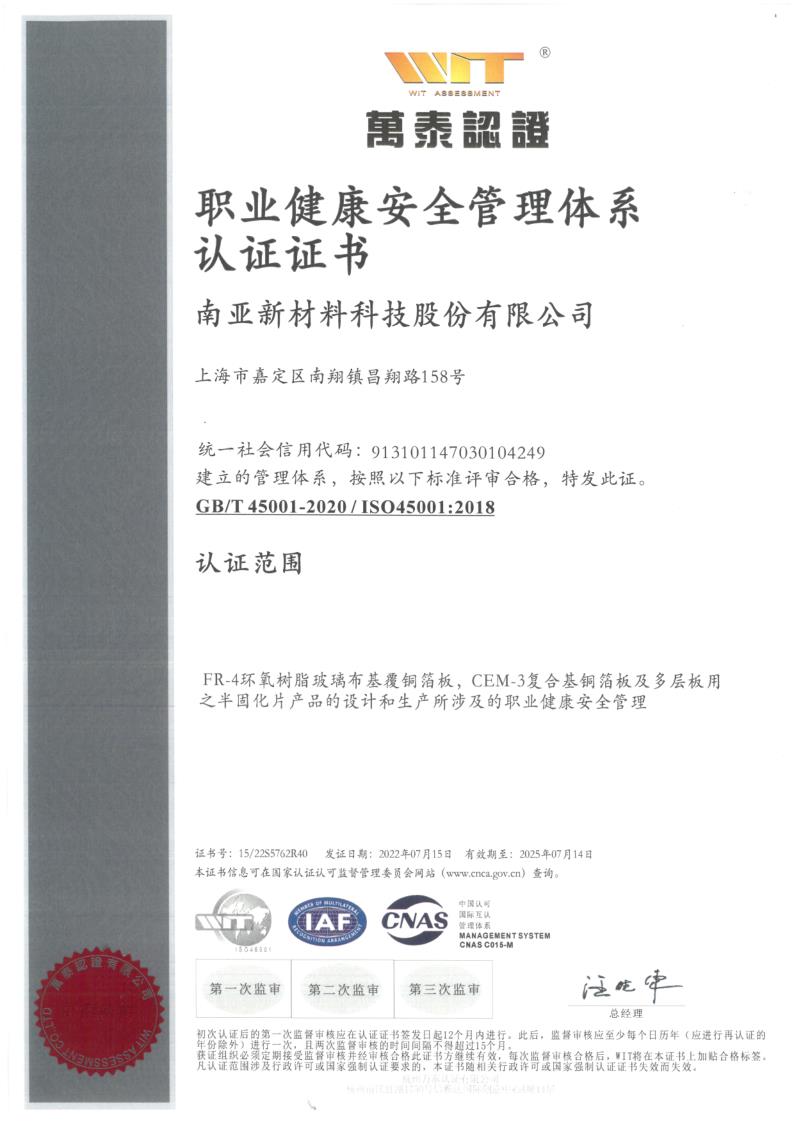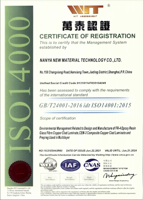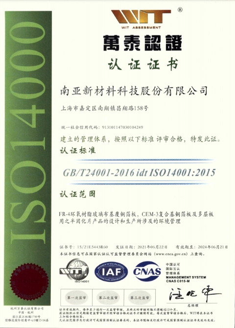 南亞新材始終堅持質(zhì)量就是生命,持續(xù)不斷的改進生產(chǎn)技術(shù)和服務(wù)水平,不斷完善質(zhì)量管理體系,務(wù)求滿足并超越不同客戶的要求和期望;經(jīng)過不懈的努力,公司先后通過了ISO9001質(zhì)量管理體系、 ISO14001環(huán)境管理體系和ISO45001職業(yè)健康安全管理體系的認(rèn)證及改版升級。